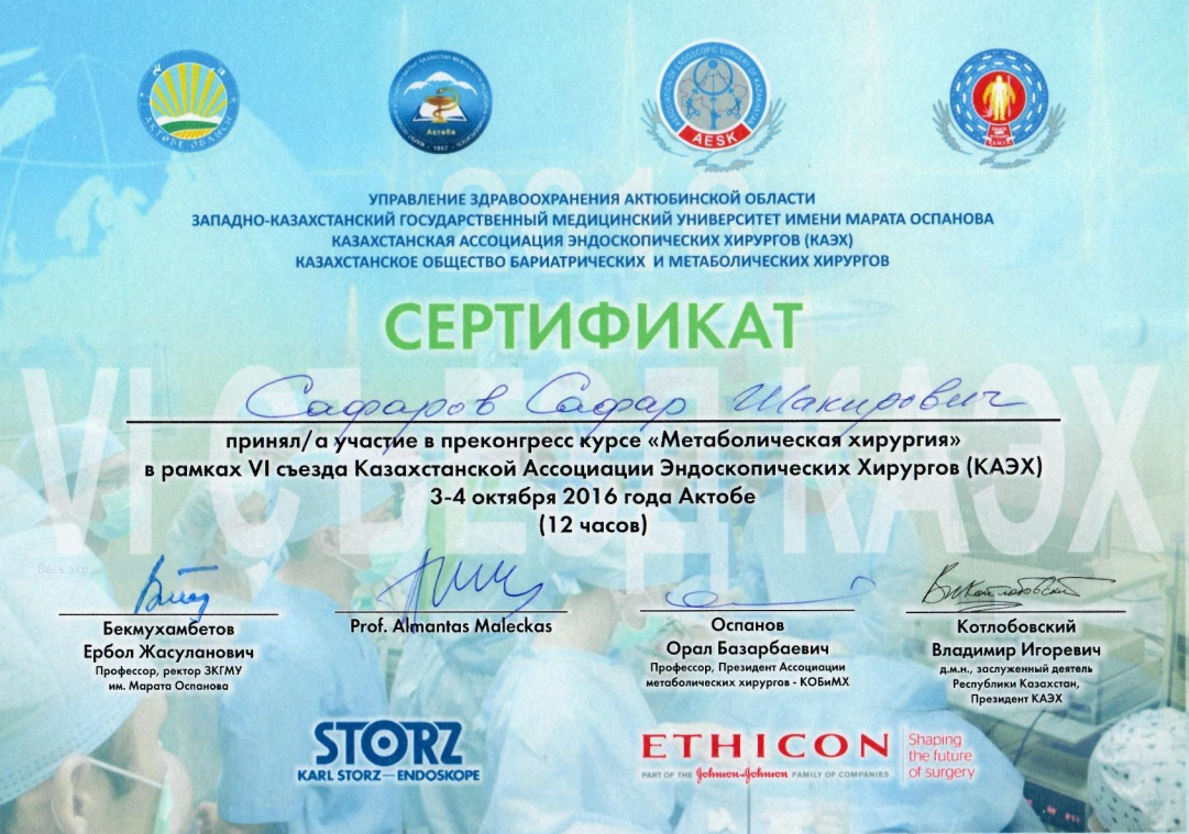 2012 – Сертификат по общей хирургии по циклу «Эндо видео-хирургические вмешательства в абдоминальной хирургии»;