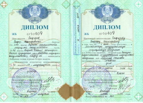 2008 – Удостоверение о повышении квалификации по циклу «Хирургия» в Павлодарском Филиале СГМА.