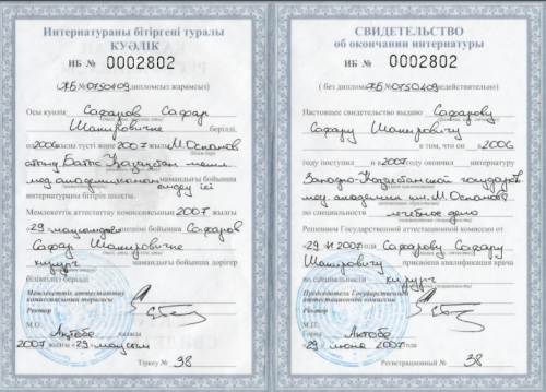 2006-2007 – пройдена интернатура по специальности врач хирург на базе Западно-Казахстанского государственного медицинской академии имени Марата Оспанова г. Актобе.